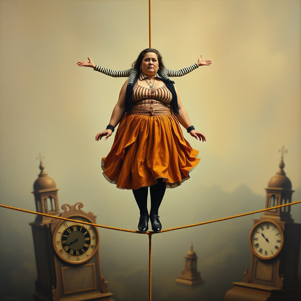 A striking picture of a stout woman balancing on a tightrope. Two slender men sit on her shoulders, providing a counterweight. The surreal scene uses bold brushstrokes and vivid colors evocative of oil on canvas.