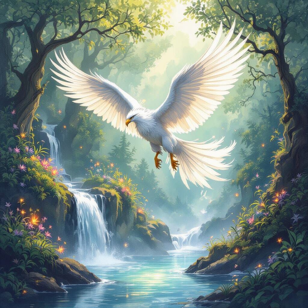 A majestic griffin flies over an ancient forest with shimmering feathers. A hidden waterfall flows into a clear pool, surrounded by glowing plants, depicted in a detailed watercolor style.