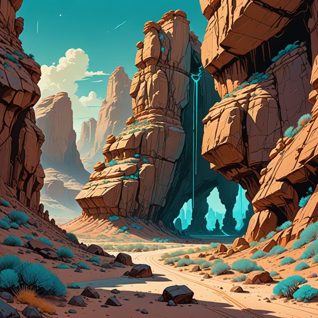 Get inspired by Feng Zhu and Syd Mead! Create your own futuristic desert environment with our AI image generator, for free.
