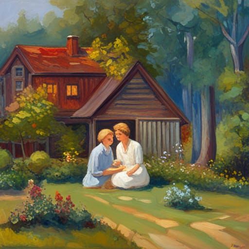 This image shows a lesbian couple enjoying a picnic in the yard of their quaint cottage. The cottage is surrounded by woods and has a beautiful flower garden, reminiscent of classical oil paintings.