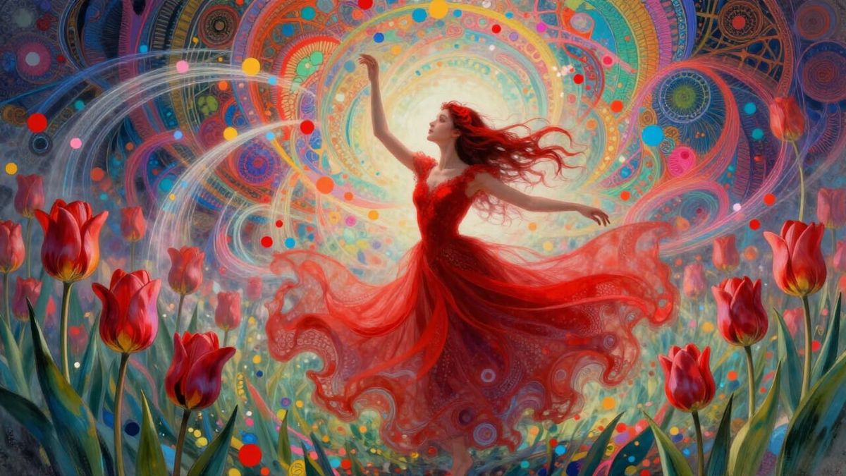 This image features a man in red surrounded by tulips, with a whimsical and dreamlike quality. It showcases intricate patterns and vibrant colors, with ethereal light and swirling energy lines.
