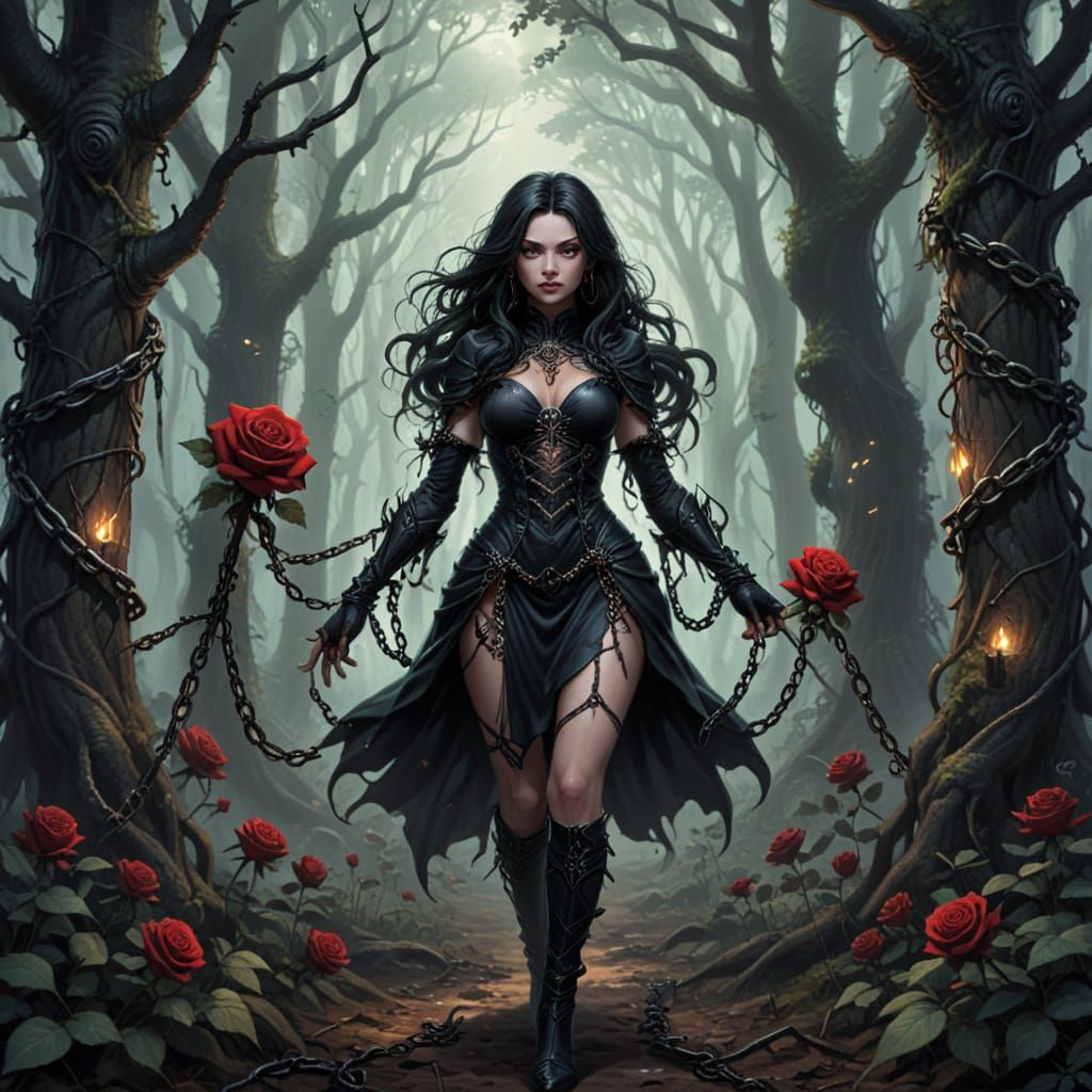 This haunting image depicts a black rose growing amidst the twisted, otherworldly foliage of an eldritch forest, shrouded in darkness and mystique.