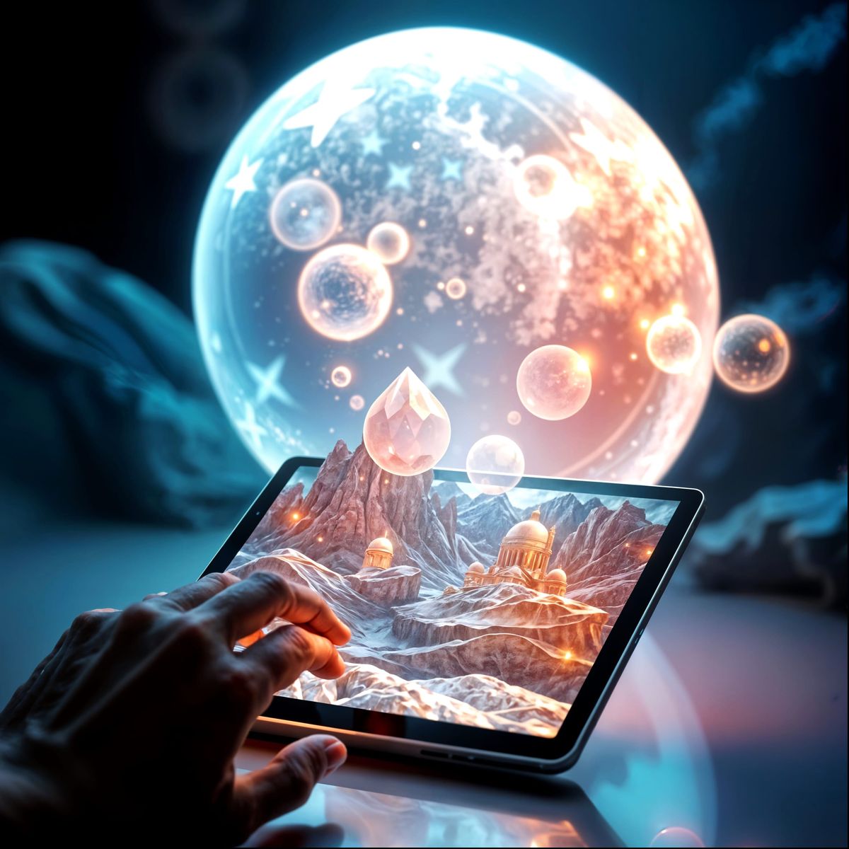 This image depicts futuristic glowing forms materializing from a holographic device. It shows a vivid, dreamlike scene where digital stories come to life in a vibrant cyberpunk aesthetic.