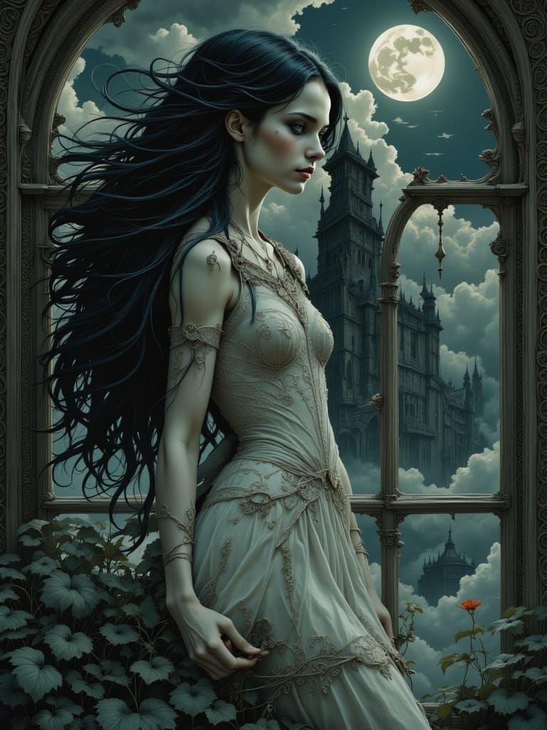 This image depicts a spectral, wild-haired woman with translucent features. Illuminated by moonlight, she stands by a grand window, embodying a dark, atmospheric digital painting style.
