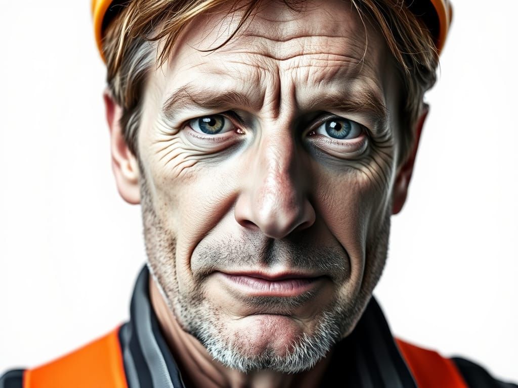 A striking black and white portrait of a man in his 40s, dressed in construction attire, set against a stark white background. The image features photorealistic details, reminiscent of pencil sketches and cinematic lighting, highlighting the subject's textures and features.
