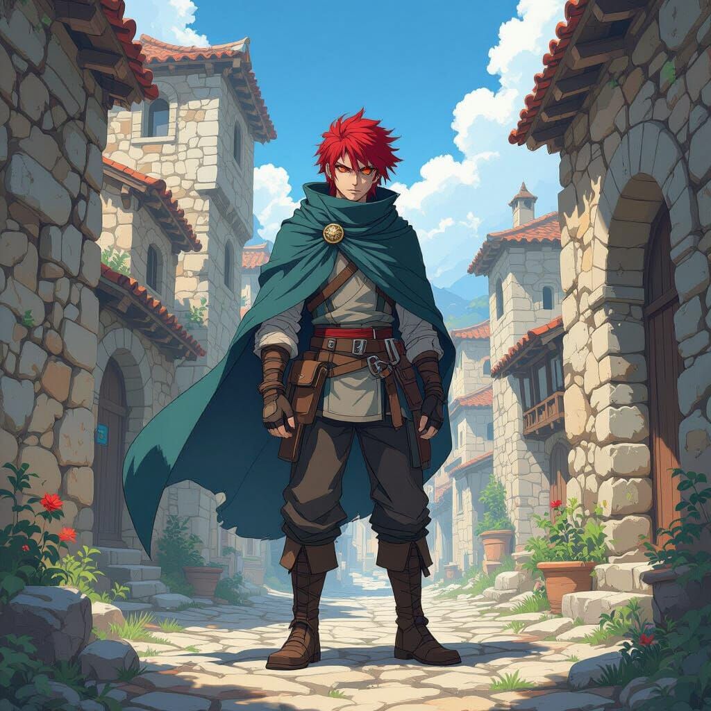 This image depicts a contemplative D-Rank shapeshifter with blood-red hair and eyes, wearing a ranger cloak in the anime style of Studio Trigger. Dramatic lighting highlights his solitary demeanor.