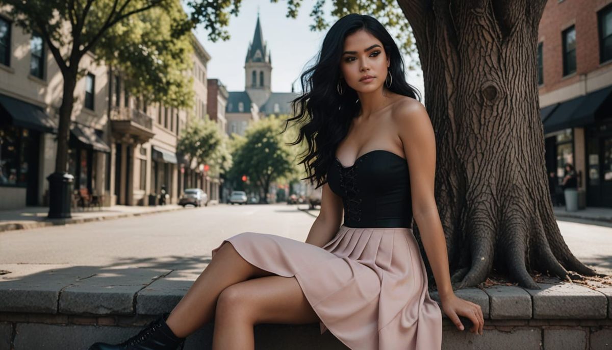 This image shows a confident young woman in a gothic-modern style outfit standing in a vibrant city. The woman is wearing a blush skirt, bustier, and platform heels, and posing against a tree.