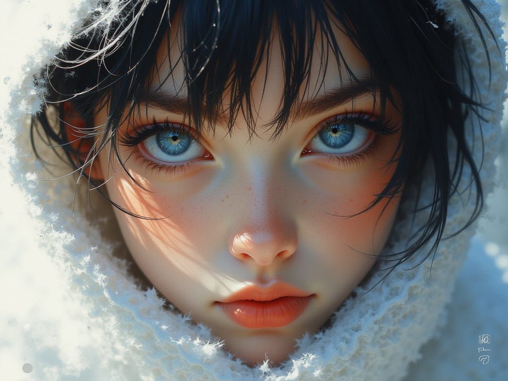 A highly detailed, high-contrast portrait of a woman with soft shining eyes. The image features intricate details and bright, contrasted colors in a soft oil painting aesthetic.