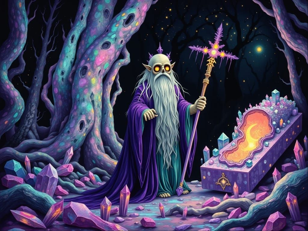This image shows a mystical scene of an ancient crone with yellow eyes, dressed in rich purple robes, standing in a colorful, marble-hued forest with crystalline structures and a coffin of glittering crystal. The scene is bathed in a kaleidoscope of clashing, vivid hues and has a hyper-realistic, photore...