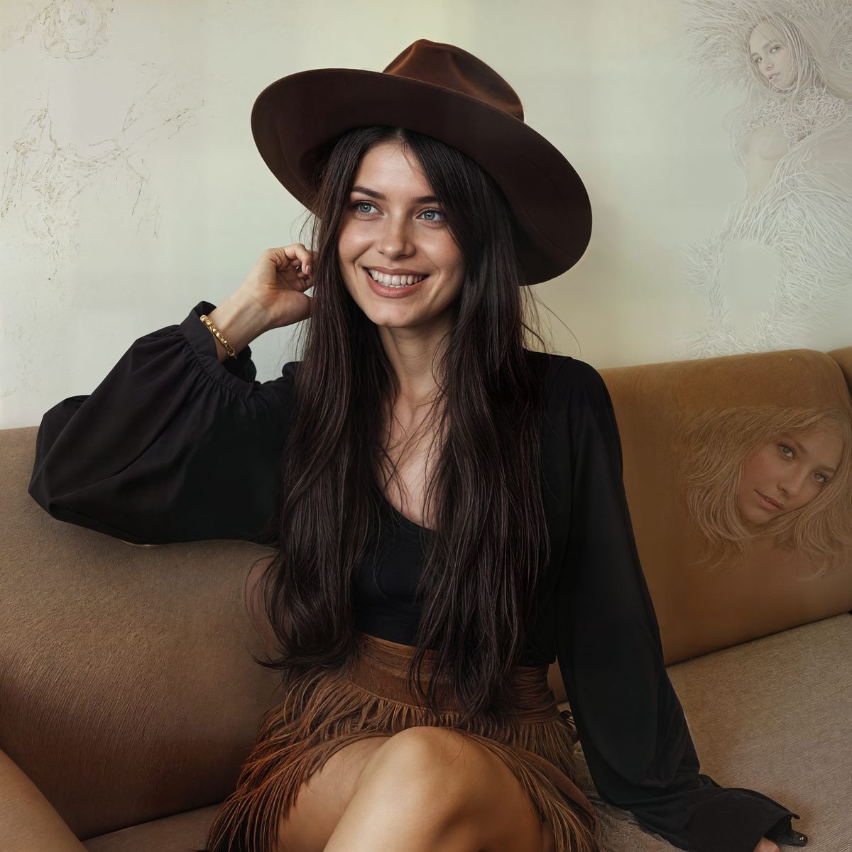 This image features a young woman in a 1970s suburban basement party house. She wears a brown suede miniskirt and a black dress, with a wide-brimmed fedora.