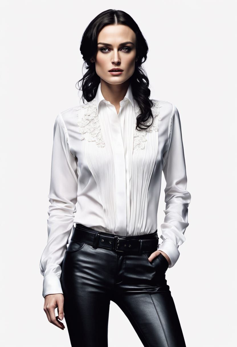 This image portrays a hyperrealistic pop singer with long black hair styled in a baroque updo. She is on stage wearing a white satin blouse, leather jeans, and high-heeled boots.