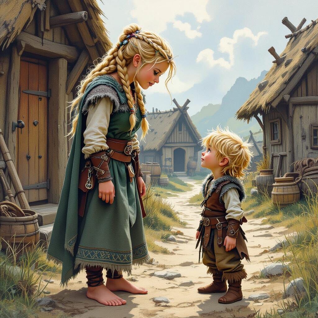 This image shows Astrid in Viking clothes as Hiccup sniffs her bare feet. The rustic Viking village scene is depicted with whimsical fairytale art elements.