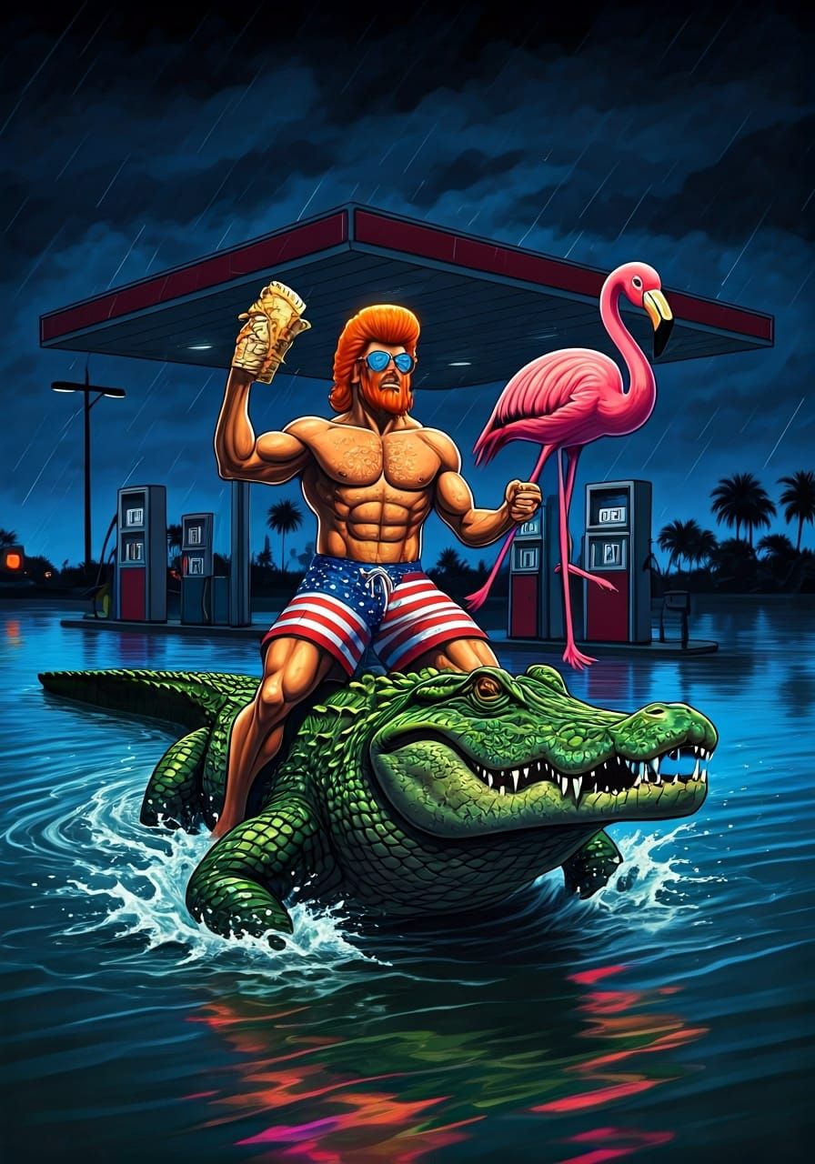 This surreal and humorous graphic depicts a muscular Florida Man riding an alligator through a flooded gas station, complete with a flamingo companion. The scene is rendered in a vibrant, almost neon style with heavy rain and dramatic lighting, creating a bizarre juxtaposition of political imagery, natural elements, and over-the-top Americana โ perfect for sparking conversation and a good laugh.