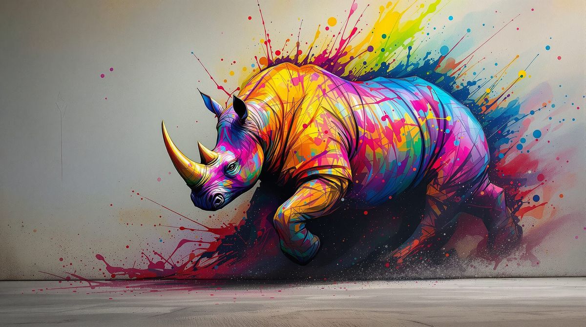 A striking picture of an anthropomorphic female rhinoceros constructed from rainbow paint, wearing an elegant dress as she bursts through a wall. The image is in a vibrant splatter art style.