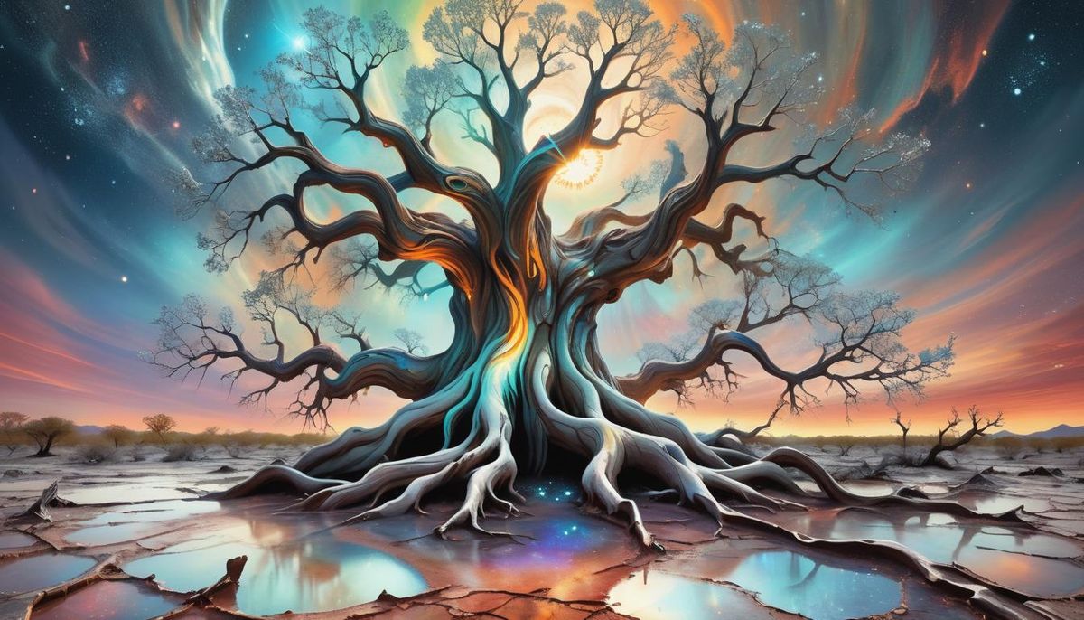 This image shows a solitary tree with luminous leaves on desolate terrain. The roots of the tree meld into the ground, while soft nebulae fill the sky in a surreal style. The artwork is rich with iridescent colors.