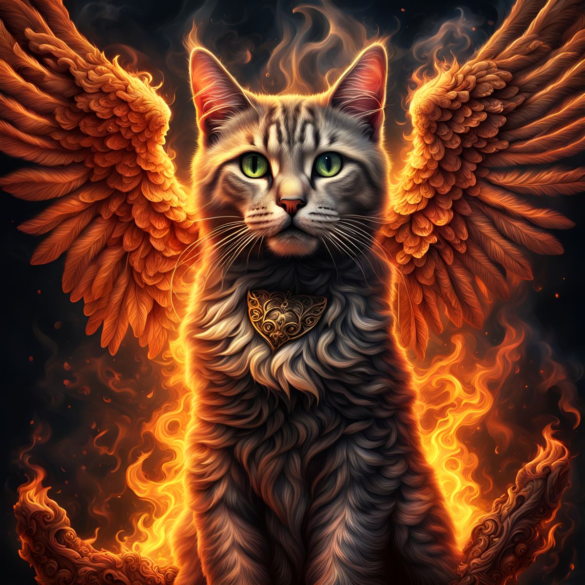 A digital rendering of a flaming angel cradling a burning cat amidst smoke and flames. The hyperdetailed image is a maximalist vision, captured with sharp focus and intricate beauty.