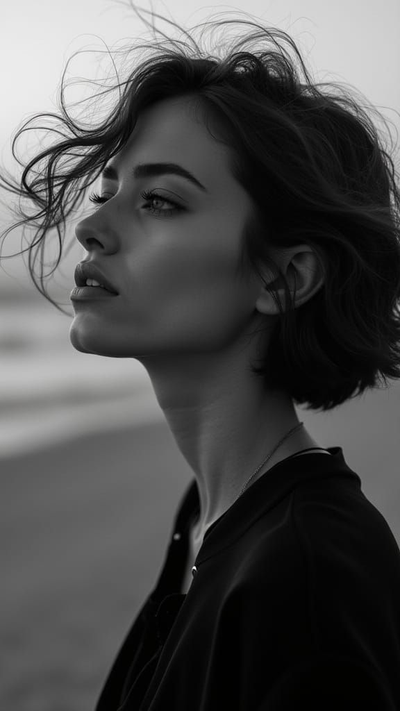 A hyperrealistic black and white portrait of a woman with wavy hair. The image captures a moment of quiet intensity, with cinematic lighting enhancing her features in grayscale tones.