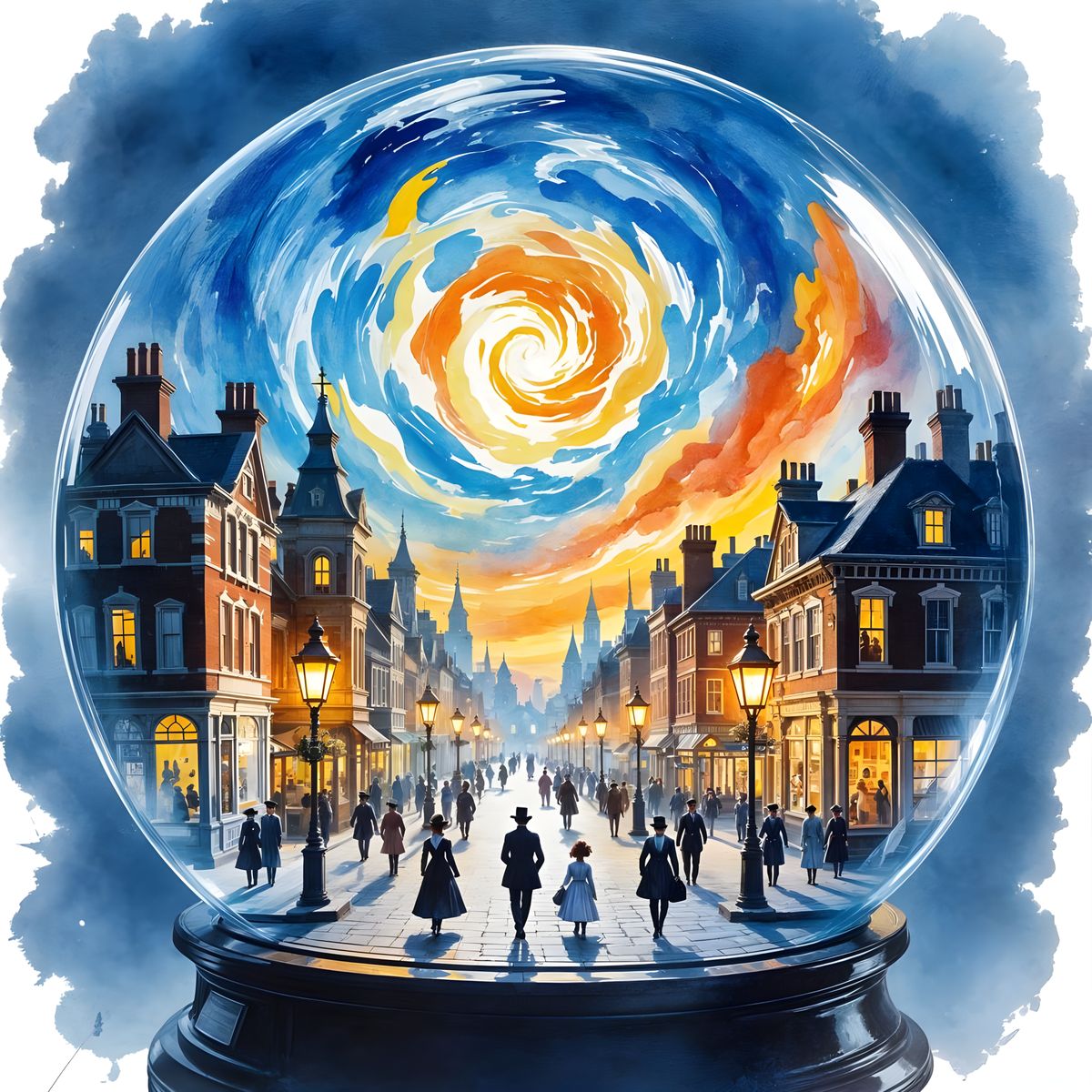 This image features a detailed miniature Victorian city street encased in a glass orb. Above, an expressive watercolor sky contrasts with the tiny world, evoking introspective wonder.