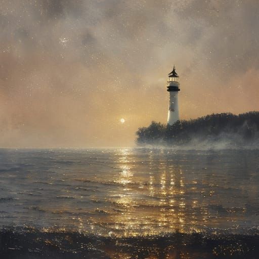 A watercolor of a lone lighthouse in gentle, moonlit waves. The artwork evokes impressionism with soft focus and blending of colors, using gentle brushstrokes and shimmering hues to create an ethereal scene.