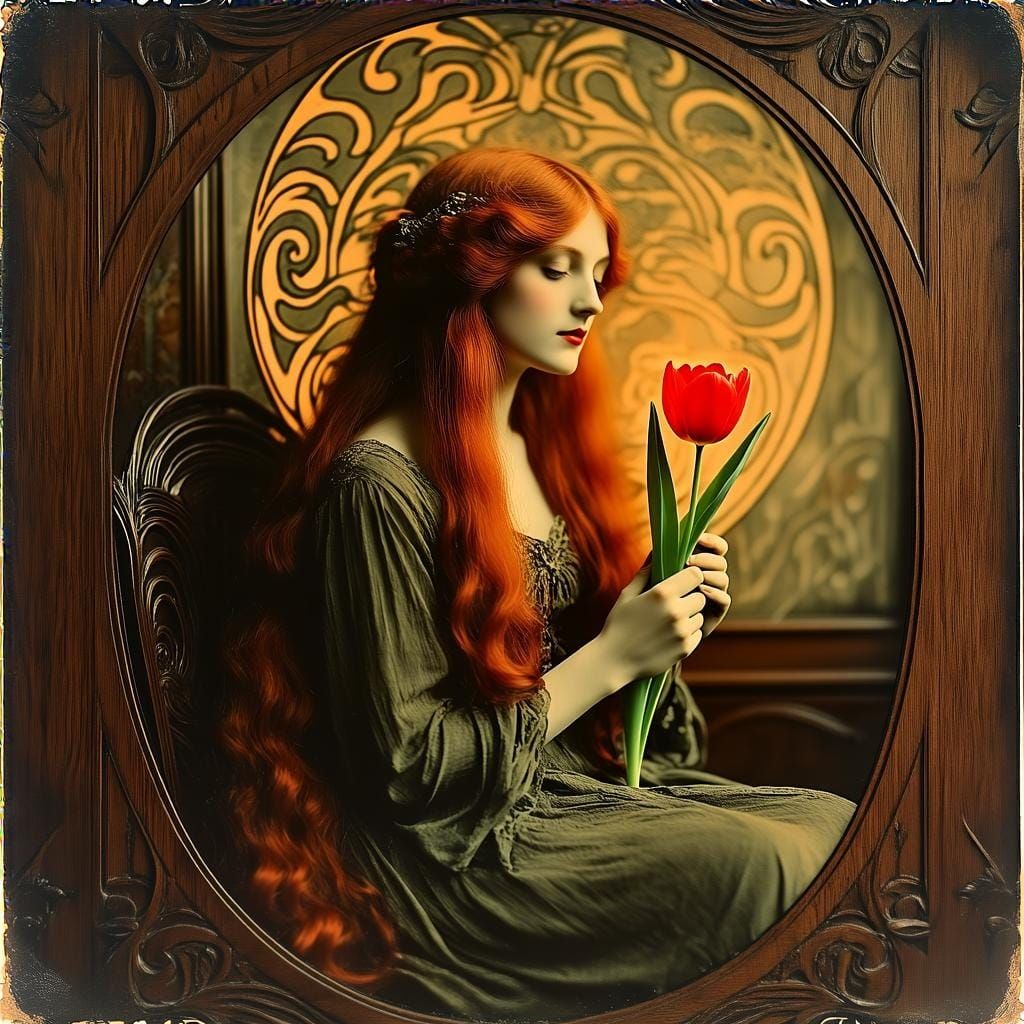 This image shows an elegant woman holding a bright red tulip in a dimly lit, ornate room. The art nouveau style is characterized by intricate patterns and a warm, golden glow.