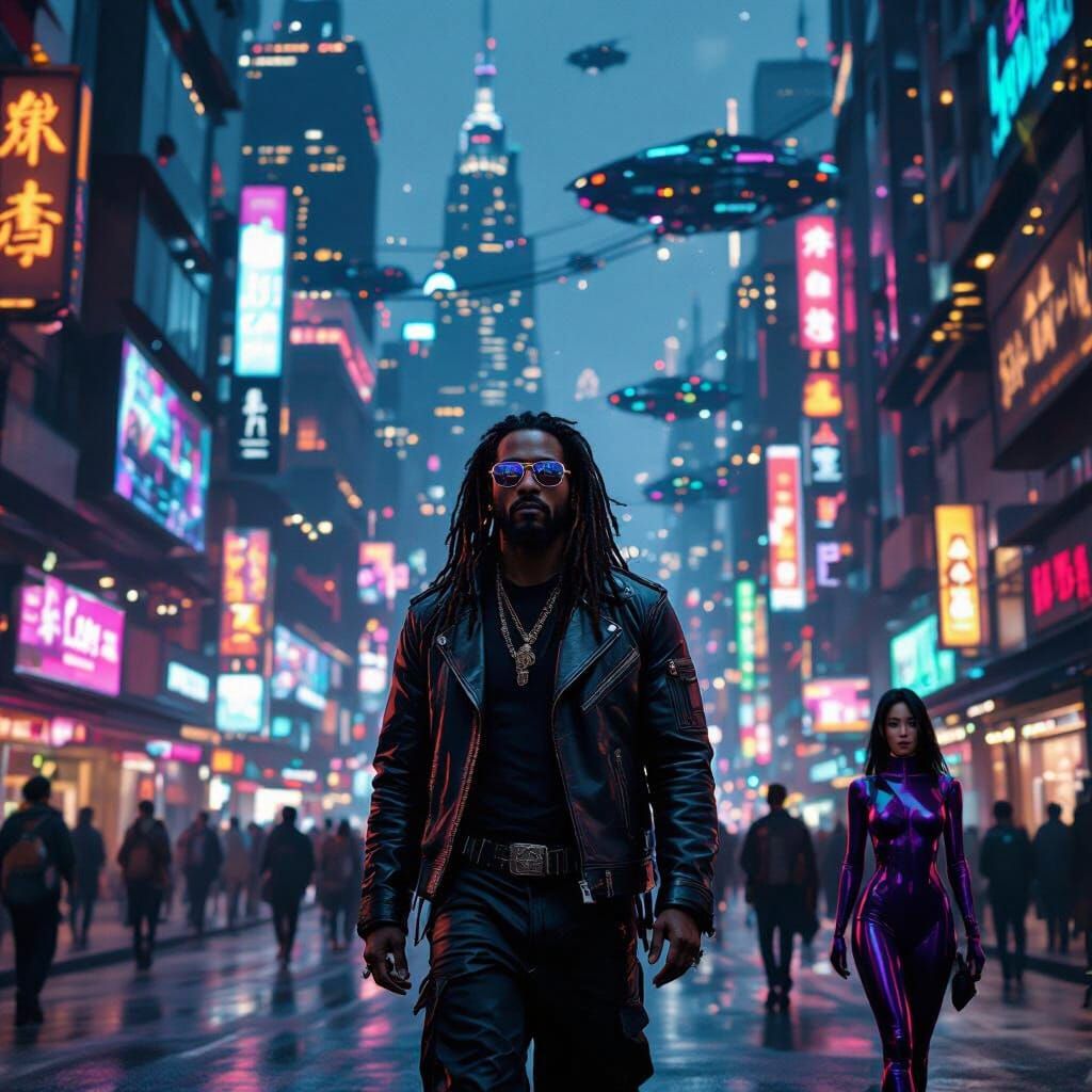 This image shows a Black man with dreadlocks and an Asian woman walking through a futuristic cityscape at night. The scene features skyscrapers, sky bridges, flying vehicles, neon signs, and holographic ads in a cyberpunk aesthetic.