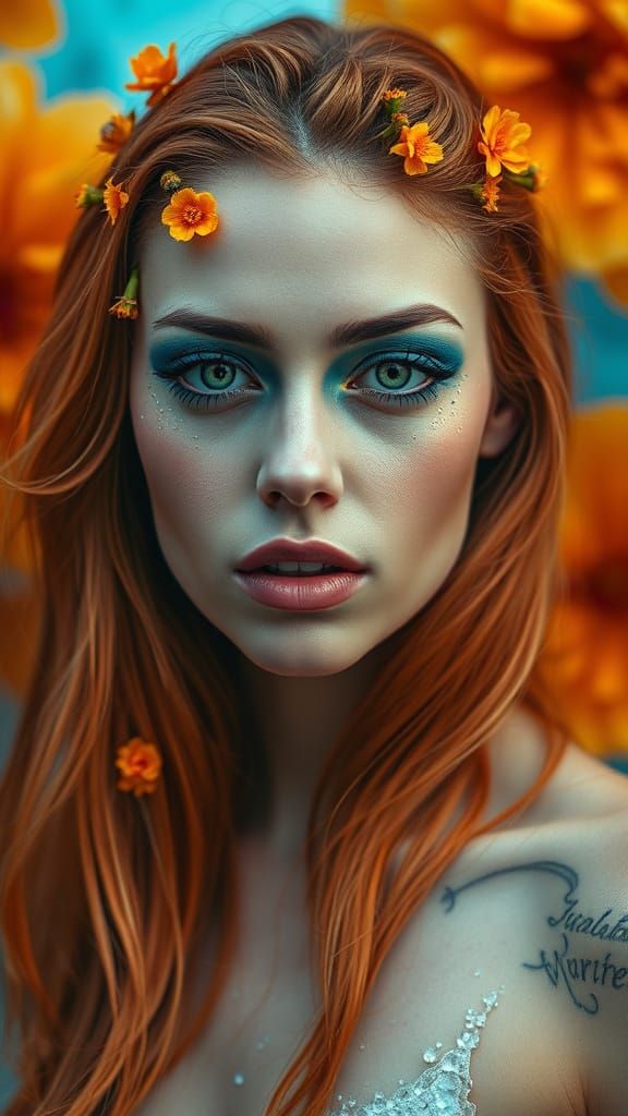 This image features a woman with intricate makeup and flowing, reddish-orange hair, set against a colorful, hyperrealistic backdrop with an impressionistic, aquatic quality.