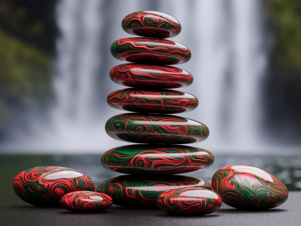 This image showcases a stunning arrangement of intricately patterned stones in a kaleidoscope of colors, set against a blurred backdrop of a serene waterfall.