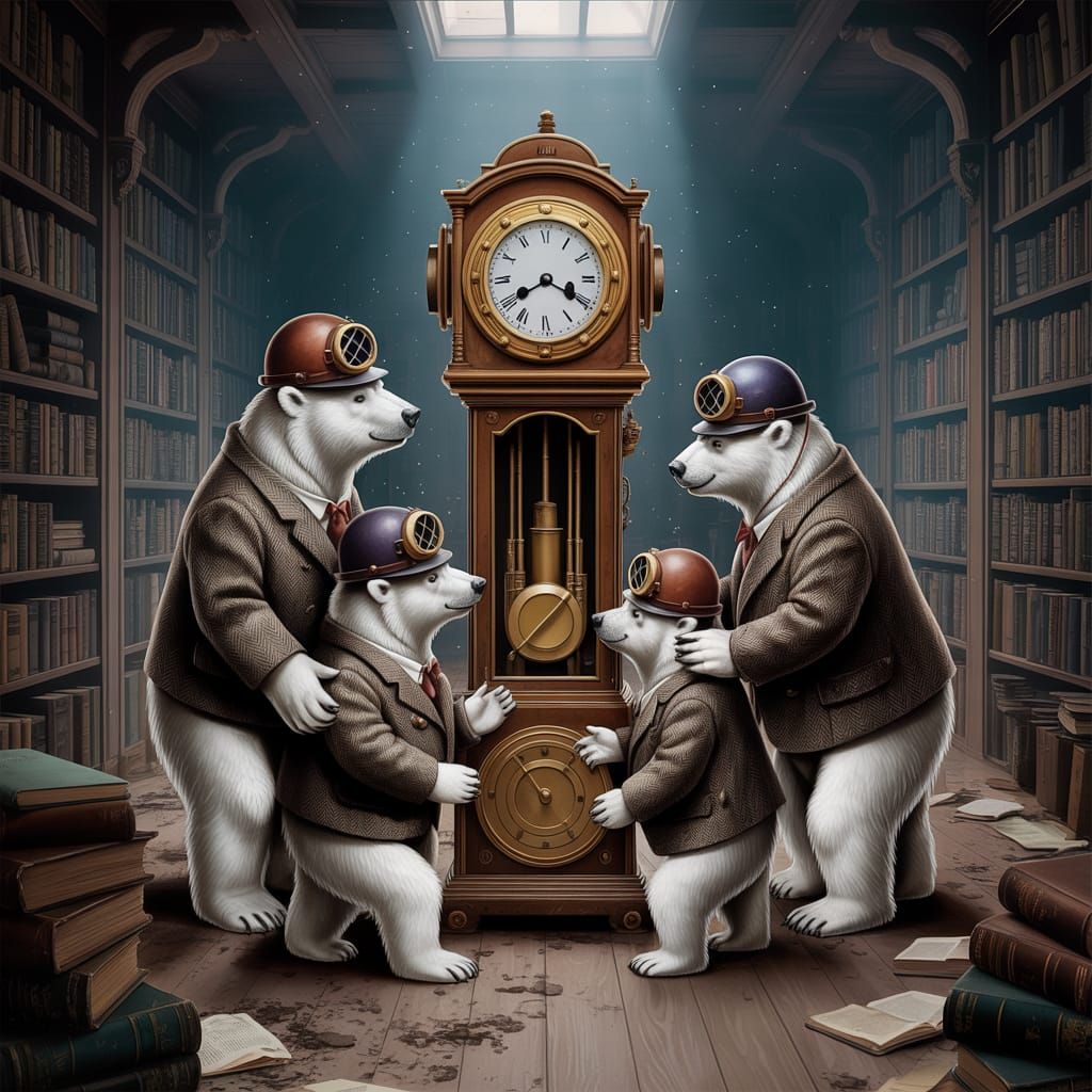 This image shows polar bears in diving helmets and tweed suits gathered around a grandfather clock in a post-apocalyptic library. The scene is rendered with intricate details and a muted color palette, reminiscent of Da Vinci's style.