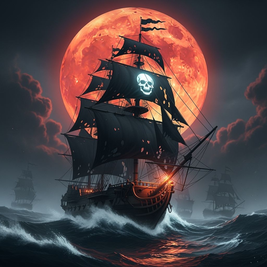 Hyperrealistic artwork of a ghostly pirate ship with tattered sails sailing through stormy seas under a massive blood-red moon. Dramatic lighting and ominous atmosphere.