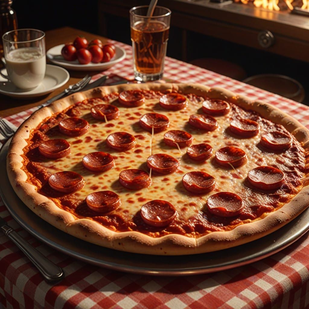 A steaming hot, classic pepperoni pizza served in a cozy, nostalgic diner. sits on a checkered tablecloth. Jukebox plays in the background. Medium shot. Photorealistic photograph. Warm, inviting. Studio lighting. A masterpiece, best quality, 8k resolution, photorealistic, diner, jukebox, pepperoni, ...