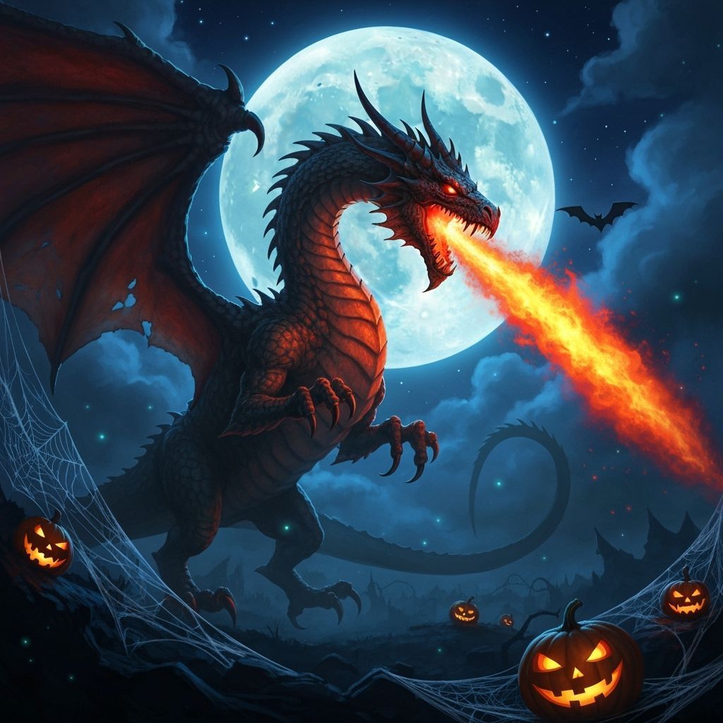 This image shows a detailed dragon breathing fire into the night sky, silhouetted against a full moon. A spooky landscape with jack-o'-lanterns is below. Rendered in a dramatic, painterly style with deep shadows and vibrant colors.