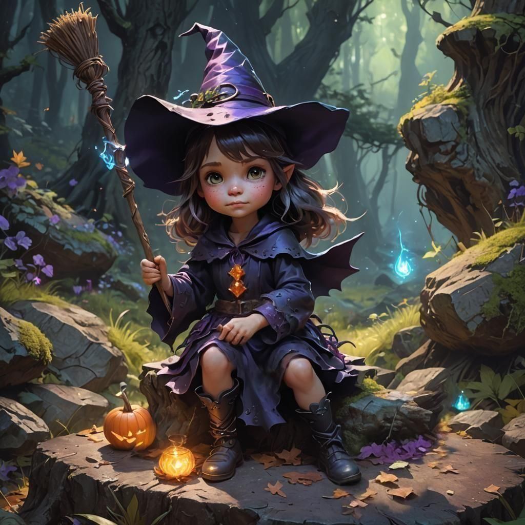 A vibrant digital artwork of a cute witch in a forest, holding a broom. This enchanting scene is rendered with dynamic lighting and rich, deep color in a dark fantasy aesthetic.