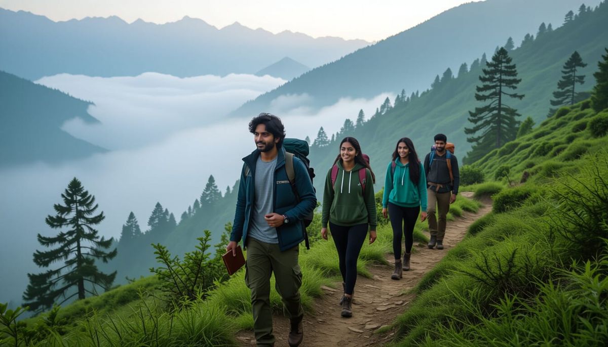 This animated cartoon shows four young Indian trekkers hiking through lush, misty green hills of Uttarakhand at dawn. A mysterious dark forest is visible in the distance.