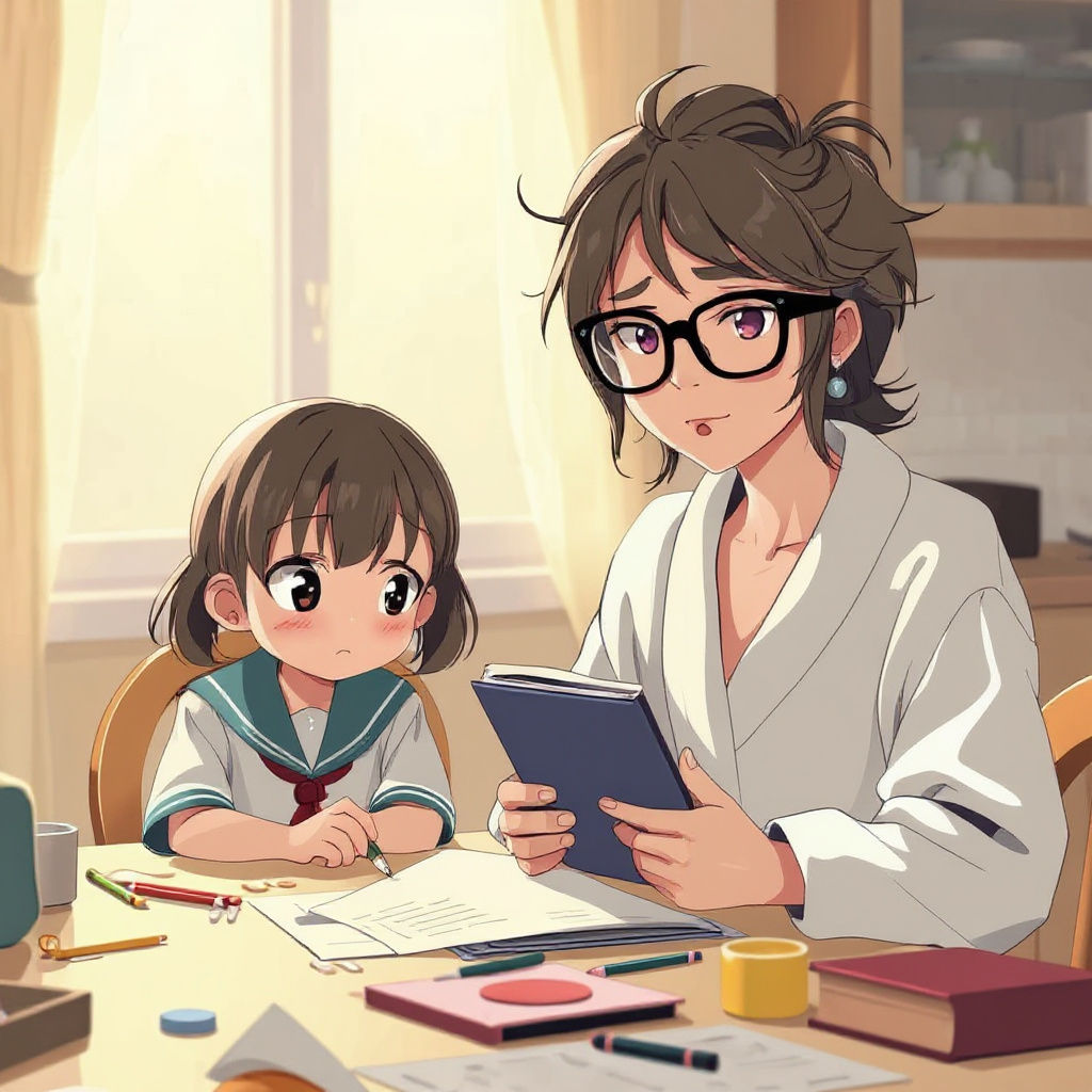 This image shows a mother and child at a cluttered kitchen table in soft morning light. The illustration features a flat, cel-shaded style reminiscent of anime art with deep colors.