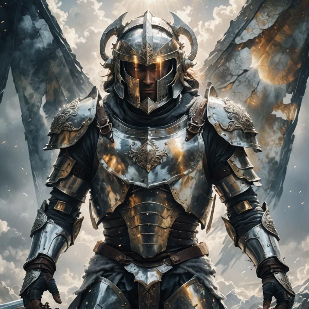 This image shows a warrior in stone-like armor standing in the clouds. Warm sunlight filters through the soft, impressionistic clouds, creating a serene, holy atmosphere with soft lighting.