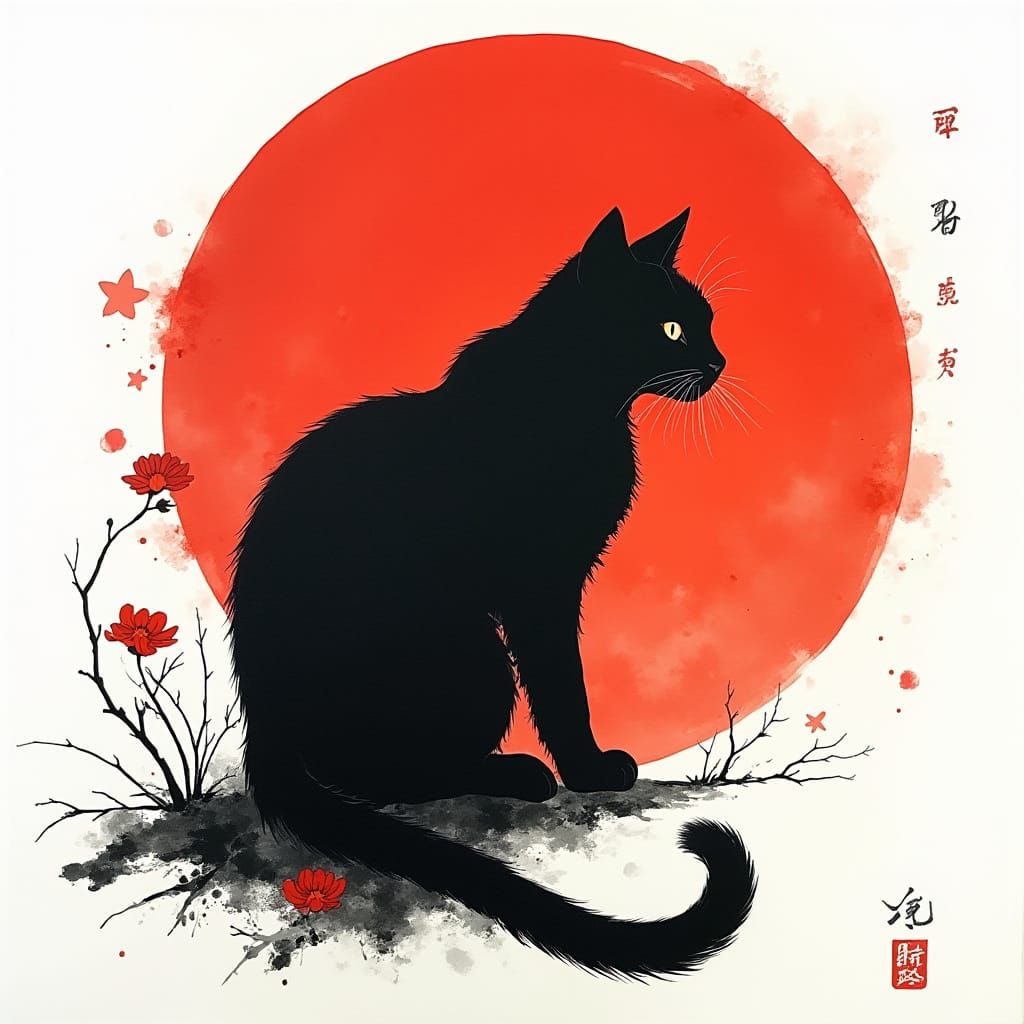 A captivating ink drawing of a noble cat in profile against a red sunset. Bold black lines and delicate red highlights create a striking contrast on white canvas, reminiscent of traditional ink art.