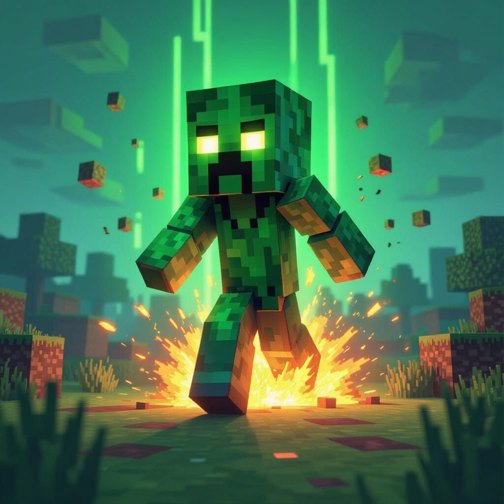 A digital rendering of a Creeper from Minecraft, exploding against a neon green backdrop. The blocky landscape and pixelated textures are reminiscent of 8-bit art.