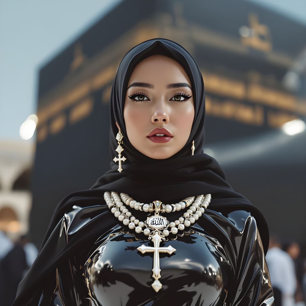 This image depicts an Asian woman in hijab with vibrant and intricate details, blending Islamic and modern aesthetics. She is adorned with jewelry and stands before the Ka'bah.