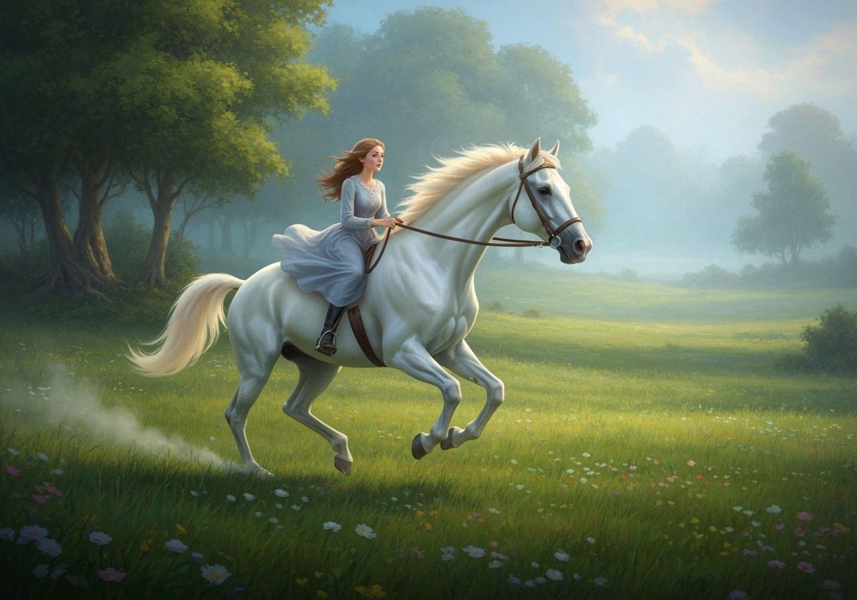 A vivid image showing a girl on horseback galloping across a green field. The artwork is reminiscent of a hyperdetailed 3D oil painting with a fantasy aesthetic and dreamy, ethereal atmosphere.