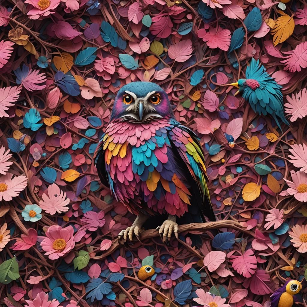 A vibrant, detailed image of an owl with rainbow beak and colorful plumage, wearing a pink tie. The artwork features complementary colors and intricate details, rendered as fantasy concept art.