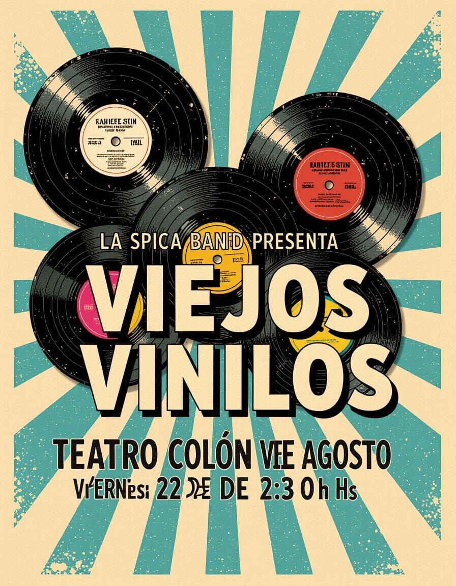 A vintage poster featuring old vinyl records with a retro distressed aesthetic. The poster advertises La Spica Band presenting Viejos Vinilos at the Teatro Colon.
