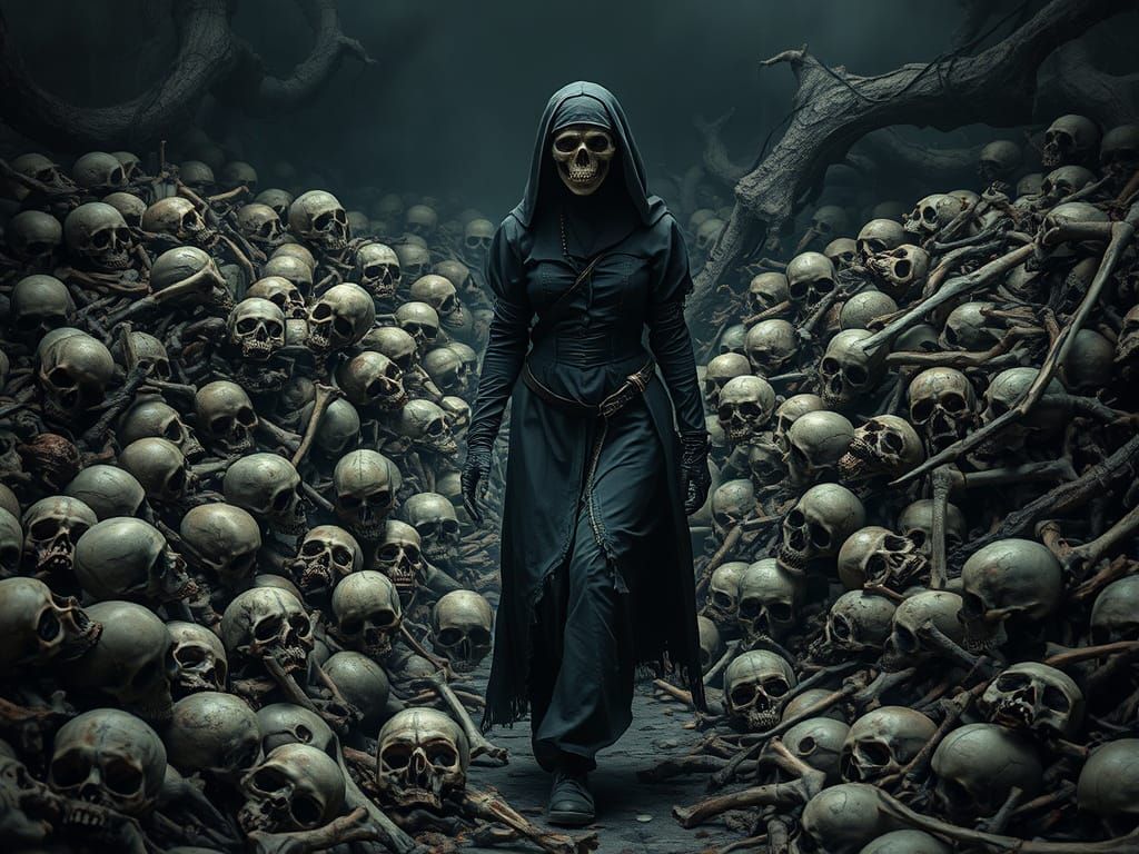 This image shows a plague nurse in torn black clothing walking through a pile of skulls and bones. The artwork features hyperrealistic details, dark tones, and natural lighting, in a surreal horror style.