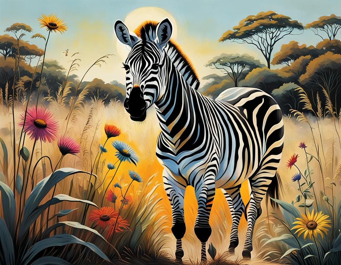 A vibrant image of a zebra in a sunny savanna. The scene blends expressive brushstrokes, dreamy colors, and rugged street art elements to capture a feeling of freedom.