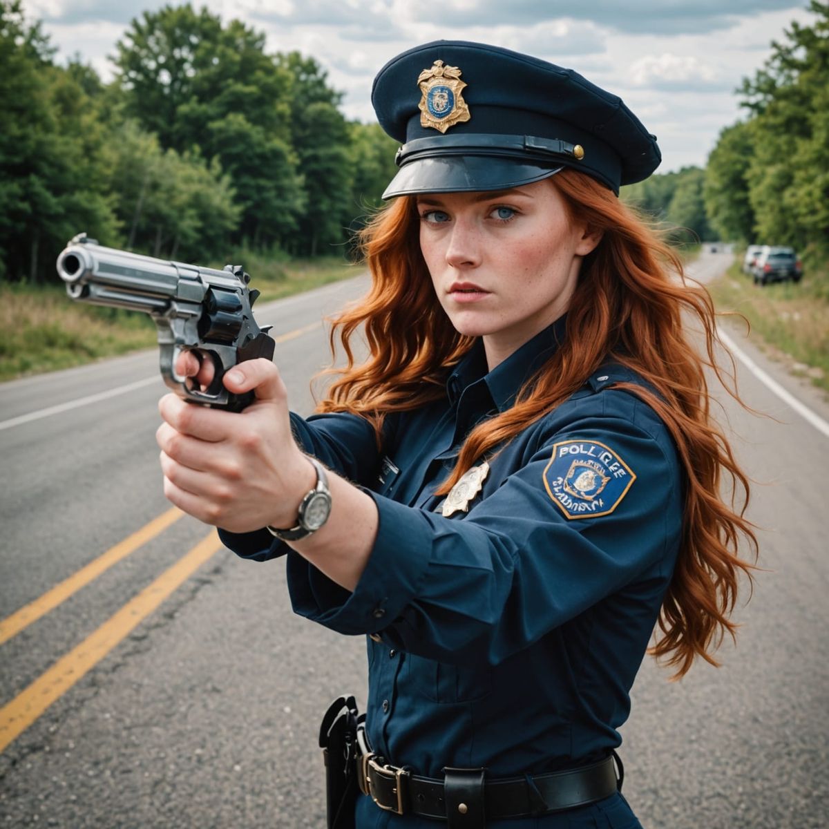 This image shows a 20-year-old female police officer with red hair and blue eyes taking aim with a pistol on a road.