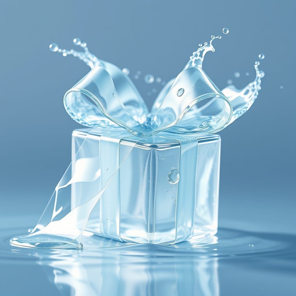 This image shows a delicate gift wrapped in a ribbon made of clear, transparent water, with soft texture and water droplets, evoking a sense of splashing movement in a highly detailed, 3D anime art style.