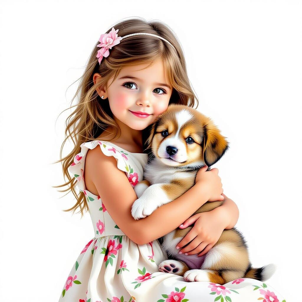 This image shows a cute fantasy girl gently holding a puppy. The full-body portrait, set against a clean white backdrop, showcases an airbrushed aesthetic and emphasizes the sweetness of the scene.