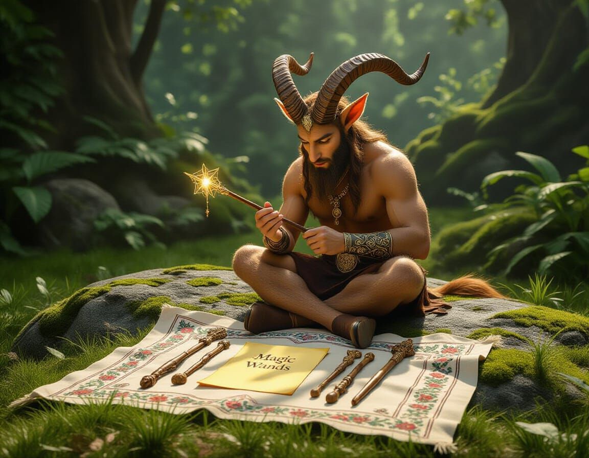 A charming faun, with horns and goat legs, sits on a rock, carving an artistic magic wand. In front of him, displayed for sale on an embroidered cloth spread over the grass, are beautiful, shimmering carved wooden magic wands and a yellowed piece of paper that reads 'Magic Wands.'