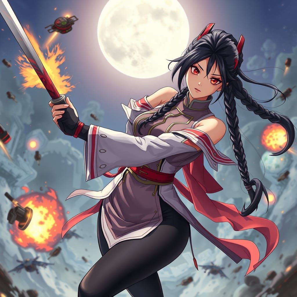 A striking anime-style image of a fierce warrior woman in a qipao with detached sleeves, wielding a sword amidst a dynamic sci-fi firefight, with cel-shaded visuals and deep colors.