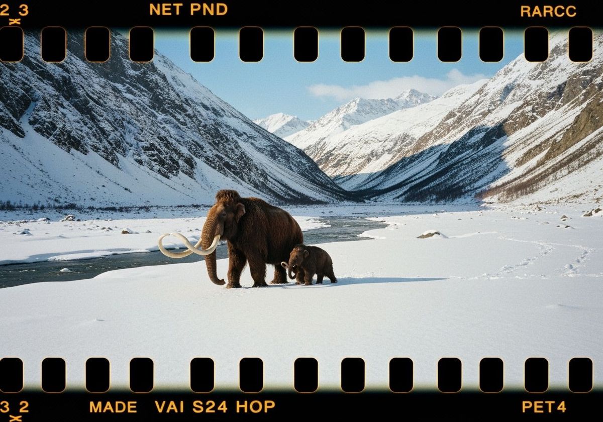 This image shows a woolly mammoth and its calf walking through a snowy valley. The photo, reminiscent of classic slide film, features vignetting, gentle light leaks, and a warm, nostalgic feel.
