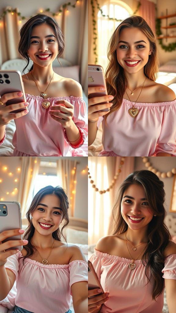 This image captures a young woman's warm smile and sweet expression, set against a soft and inviting background of garlands and cozy bedding, all in a vibrant pastel color palette.